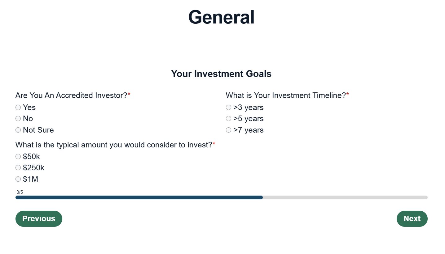 These panels capture experience and goals while integrating the accredited investor check. We adjusted for HubSpot’s rigid tracking terms and preserved clarity. The flow balances compliance with personalization to support conversions.